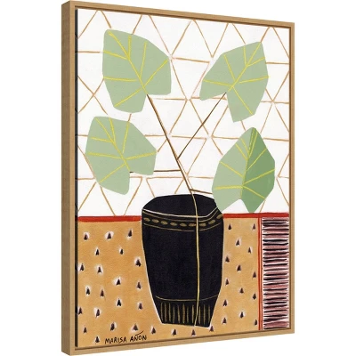 ART DESCRIPTION: A stylistic still life makes for an interesting composition in this unique print. The gold patterned tablecloth sits under a black planter, which holds a single stem with green leaves. The geometric pattern on the wall adds texture to the image. This Amanti Art canvas art print was created by Marisa Anon and printed by Amanti Art in Madison WI. The canvas is stretched by hand and finished with a float frame. Individually made using traditional custom framing techniques, it has the quality you would expect from your local frame shop. Because of our attention to detail and focus on artistry, architects, interior designers, and homeowners alike choose this framed canvas artwork to create beautiful living spaces.