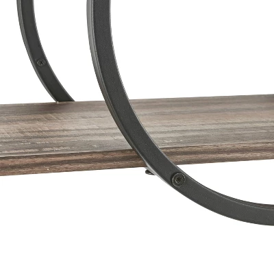 Make a design statement with the Antigua Crossed Double Circle Shelf Unit. Simple and understated, this shelf unit features an industrial style with two levels of distressed wood finish laminate shelves held together by circular black metal frames. An effortless addition to all modern spaces, thanks to its sophisticated, pared-down design. Mount it in your living room or bedroom to store or display picture frames, books, vases, keepsakes, and collectibles; or use it to update your kitchen or bathroom décor while storing kitchen or bathroom supplies.