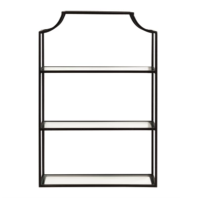 A wall shelf isn’t just for storage! Now your space-saving storage can be a dazzling and show-stopping wall display. That’s what makes the Ciel shelf is an incredible addition to your modern wall decor. It features three tiers of lovely and resilient glass shelves within a scalloped metal frame, creating a jaw-dropping display and storage solution for all your favorite keepsakes and household necessities. Its sleek black finish gives it the style that fits into any decorative aesthetic and room of the home. The Ciel shelf is 20.25 inches wide by 6 inches deep with a height of 30 inches, making it the perfect addition to any living room, bedroom, bathroom, entryway, or dining room wall. Each shelf has a 10 lbs. weight capacity and is 20 inches wide by 5.5 inches deep, with 9.5 inches of space separating each tier for keepsakes, photos, bathroom necessities, plants, and other household necessities. Hang this beautiful scalloped wall shelf in only a matter of seconds with the convenient metal eyelet hangers securely attached to the back of the metal frame.