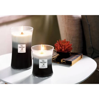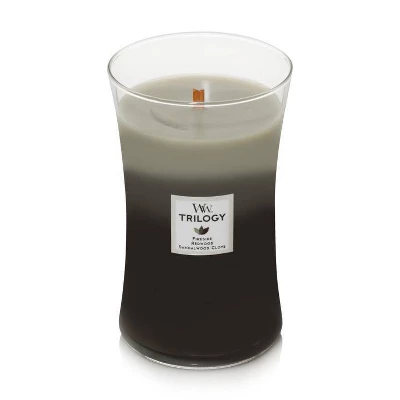 Fill your curated home with the rich, nuanced scents and the distinctive, iconic look of the Woodwick Large Hourglass Candle with a wooden lid. The Pluswick® Innovation wooden wick enhances the sensory experience with a distinctive crackle and intriguing glow. The WoodWick Trilogy Hourglass Candle features 3 layers for a rich blend of colors and fragrance.