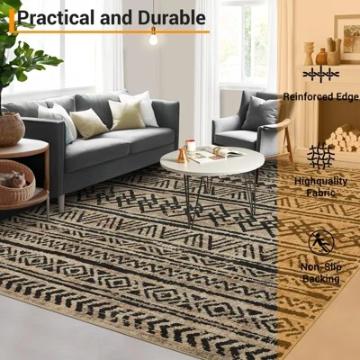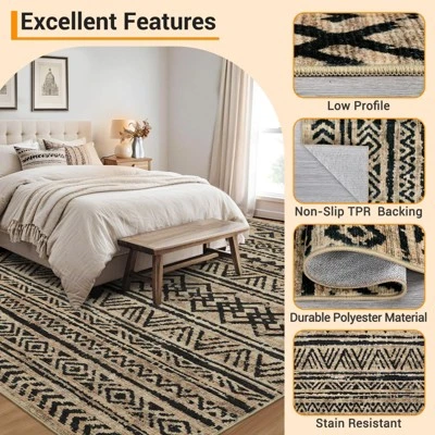 1.Modern Boho Geometric Design Featuring an artistic blend of triangles, diamonds and clean lines in soothing neutral tones, this rug adds contemporary boho flair to any space. The minimalist pattern creates visual interest while complementing modern, Scandinavian and eclectic decor styles. 2.Ultra-Convenient Machine Washable Designed for real-life messes, this rug is completely machine washable without fading or shrinking. Simply toss in cold water (gentle cycle) and air dry for effortless refreshment – perfect for homes with kids, pets or high traffic. 3.Secure Non-Slip Performance The advanced TPR rubber backing with textured surface provides superior grip on all floor types. The dense polyester construction prevents shifting or bunching, ensuring safety in active households. 4.Thin Yet Durable Construction At just 0.3″ thick, this space-saving rug slides easily under furniture while the reinforced edges prevent curling. The high-density weave resists shedding and maintains its geometric pattern beautifully over time. 5.Versatile Multi-Space Solution From living rooms to kitchens, this 5×7 rug adapts seamlessly to any area. The neutral color palette blends effortlessly with existing decor while the durable materials stand up to daily wear.