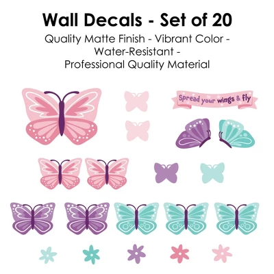 Big Dot of Happiness Beautiful Butterfly Wall Decals includes 1 sheet of 20 assorted vinyl wall art stickers that you can arrange to add a special touch to your home decor. Wall Decal sheet measures 50” wide by 16.5” tall. Pieces range in size from 15 x 10.75” to 3.5 x 3.25”. Effortless Decor: The Pink and Teal Butterflies wall stickers are an easy solution for bringing in some added charm to your space within minutes! You can use the wall decals for nursery & kids’ rooms, impressive photo backdrops, or as easy decor at your Baby Shower or Birthday Party. Easy to Use: Beautiful Butterfly vinyl decals are easy-to-peel and repositionable. Wall art stickers will adhere to various surfaces including painted walls, plastic, wood, glass, and metal. To use, make sure your surface is clean and dry. Slowly peel the sticker from the paper to avoid tearing and smooth over with your hand. They are also easy to remove, leaving no residue. High-Quality Supply: Beautiful Butterfly wall stickers come with a quality matte finish and vibrant colors. They are printed on water-resistant professional quality material and will arrive on one full sheet rolled. Made In The USA: Pink and Teal Butterflies Wall Decals are designed and manufactured at our Wisconsin facility using materials that are Made in the USA.