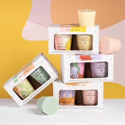 Start with an approved Good Chemistry Glass Candle, then remove the refillable candle from the packaging by pushing the bottom of the refill container upward and gently pulling out the candle by the wick. Place the candle refill in the clean, Good Chemistry glass, then you’re done. Enjoy!