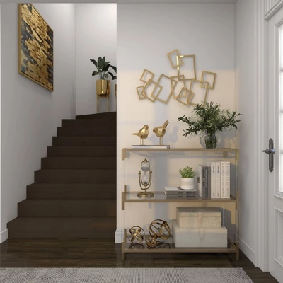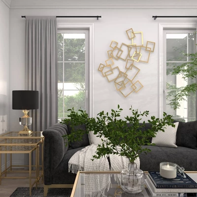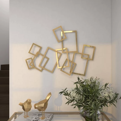 Display this lavish wall art for an elegant touch to any modern and contemporary living space. This item ships in 1 carton. Features 10 interconnected rectangular metal frames. Can be hung horizontally using the sawtooths on the back; nails and screws not included. Suitable for indoor use only. This item ships fully assembled in one piece. This is a single gold colored wall sculptures. Contemporary style.