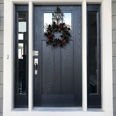 This Halloween wreath features an assortment of black rose blooms, some sprinkled with silver glitter, springing from a woven branch ring base. It is trimmed with big black spiders and has a flowing mix of black leaves and spindly branch twigs for added creepiness. Eyeballs emerge from some of the roses to give an even more frightening flavor. Display this decoration on door, wall, or window in indoor or covered outdoor locations.