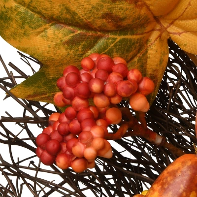 This harvest wreath features maple leaves, pumpkins and gourds in autumn orange colors flowing from a woven branch ring base. A backing of twig tips and berry cluster trimmings create added seasonal appeal. Display this autumn accented wreath on doors, walls and windows in indoor or covered outdoor locations.
