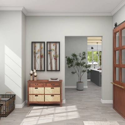- Blue and red metal bird sculptures, textural and realistic-looking tree trunks, open backing picks up color and pattern from your wall or wallpaper