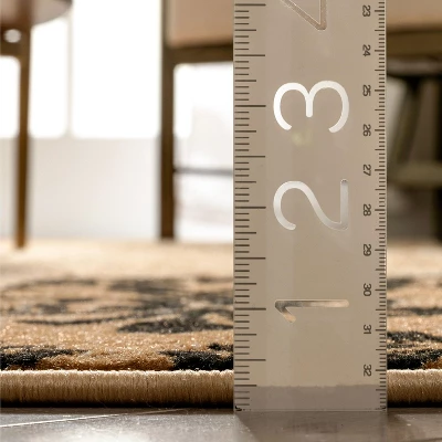 Florence Damask Beige is a classic Oriental style with fresh, modern design elements. A simple border and gradient pattern is accented with a floral design and woven in warm, neutral colors of red, ivory, and beige with a pop of black. Double point weaving gives this rug an extra luxurious feel and although it is machine made, drop-stitching around the pattern edges give a unique hand carved look. A plush 0.4″ pile of BCF polypropylene yarn is soft, stain resistant, and doesn’t shed or fade over time. A 100% jute backing is safe for wood floors and all four sides of the rug are serged for improved durability.