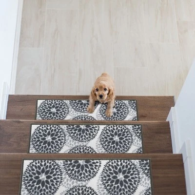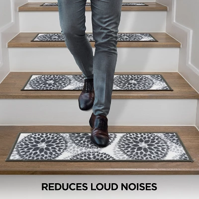 Enrich your stairs with these stunning, yet practical and decorative, stair treads. The floral circle design add interest and style to every step. The rubber backing provides additional safety for climbing kids and pets. At 26 inches x 8.6 inches, these machine washable treads are ideally sized for the majority of stairs.